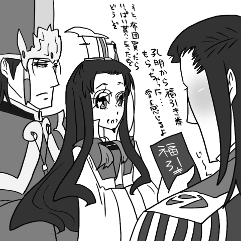 あと、時折戦闘終了後に福引券というものを貰えるのですが(ちなみに武器の福引ができるそうです)、本日初めて孔明から福引券を貰いました~。