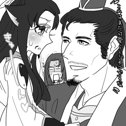 色々変なのは素直に認めます。久しぶりにしっかりオッサン描こうとすると何か分からなくなりますね!孔明がニャンになってしまったのは抱っこされてる系にしたかったからです。