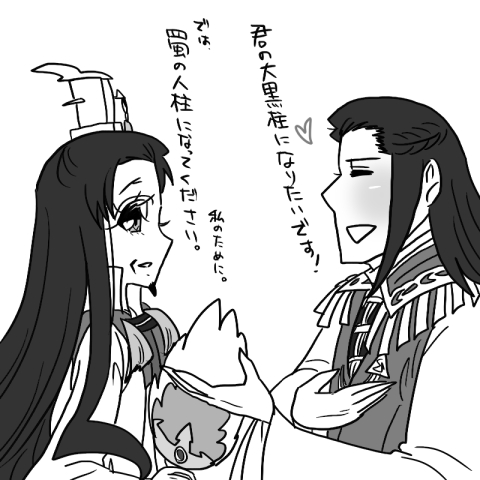 あともう一枚。孔明と都督が定軍山の戦いについて回顧してる図に添えられた解説文を見てついつい。その解説というのが、「”臥龍”と呼ばれた諸葛亮と、呉の大黒柱である周瑜」というものですが、これを見て、そういえば都督って大黒柱か、と思ったら、ちょっと謎のプロポーズ作戦を決行してしまいました↓