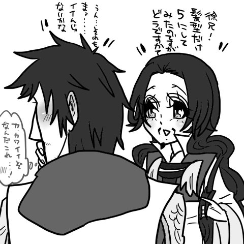 徐庶さんが出た当初は徐←孔みたいなノリが濃かったはずが、最近両想いになってきたなァ~という感じになってきて、遂に今日は徐→孔なネタです。徐庶さんの方が孔明を意識しちゃってて、孔明の方は「徐兄は徐兄」くらいにしか思ってません。そんな中で孔明が髪型だけ5にイメチェンしてきた模様です↓