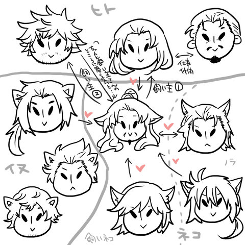 というわけで添付です。色んなCP入り乱れて、昨今わけがわからなくなっている(であろう)ニャン孔明ネタについて、相関図らしきものを描いてみました↓