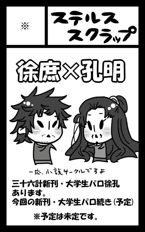 ご覧の通り、新刊予定は未定ですが、一応現時点では三十六計新刊『スプリング』設定での大学生パロ徐孔の続き(厳密にいうと続きというかなんというかという感じなのですが)の予定です。それと、今回は諸葛亮受けアンソロジー様に参加させていただきますので、そっちの原稿のネタだしもしなくてはです。ただ、そっちの方は既にタイトルは決定しましてます(お)。言いませんが←