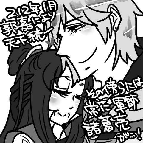 エンディングで、「郭嘉の傍らには常に軍師諸葛亮が…」って入って郭孔らぶらぶエンディングだったのでもうどうしましょう…!おらはやっただー!おらはやっただー!!って謎の田舎っぺ全開で郭孔エンディングを喜びました(マジです)。自分が皇帝or君主だと統一エンディングは必ず1になるとは思うんですけど、傍らに~は誰が出るかはランダムか、もしくは友好度が高い人だと思うんですが、郭奉孝の国は人が少なかったせいで実は皆友好度Sの超仲良し国家だったので(総メンバー→郭嘉(皇帝)、馬岱(義兄弟、大将軍)、孔明(義兄弟、軍師)、張良(エディット、嫁)、星彩、呂蒙、司馬懿、許チョ、孟獲、姜維)、多分出るなら孔明か馬岱か、張良スンかな…?と思ってたのですが、奇跡的に孔明でしたよ!大手柄で孔明に褒められもしたしね!これは嬉しい!ウフフー←