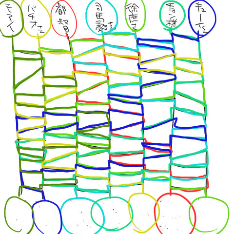 こんなあみだをやってみまして…。下の○の中には設定というか孔明との関係が書いてありました。というわけでこのCPはこの設定で現パロ短編書いてみよー、と。でそれを一冊にまとめよー、と。そんな方向性にしてみました。ちなみに攻ズ選抜メンバーの中にモアイがいて劉備さんがいないのはなんとなく気分です←