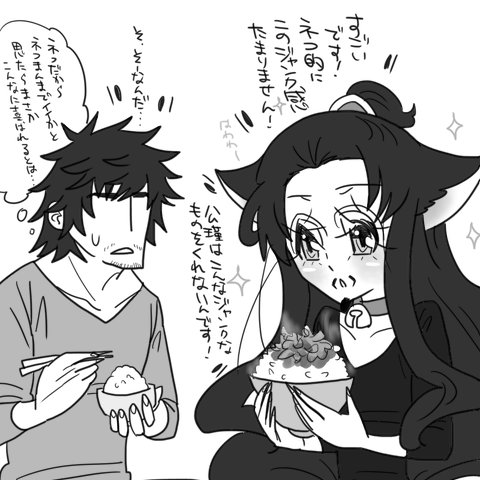 恐ろしいことを考えるのはヤメにして添付にいきます。添付はニャン孔明と徐庶さんです。遊びに来たニャン孔明のお腹が鳴ったので、とりあえず何かご飯でも…と思ってネコまんまを作ってあげた徐庶さん↓
