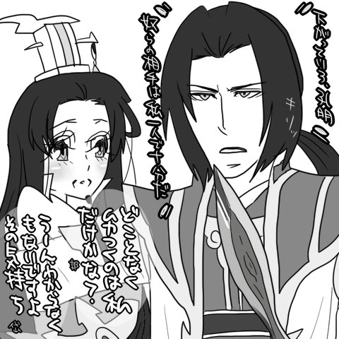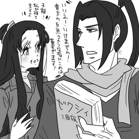 というわけで添付です。突然ですが、ゼ○シィって雑誌があるじゃないですか。アレって恐るべき程に重いんですよ。で、アレを一人で買う女子は決してたおやかな女子ではないと思っておりまして(※個人の意見です)、そう思っていたらふと、「ゼク○ィを買いに来たんだけど決して孔明には持たせようとしないチョン様、ひいては趙孔」というのを妄想してしまいましたのでそんならくがきを↓