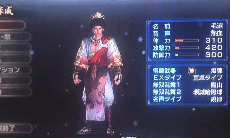 毛選の特徴は、アフロと筋肉質です。あと衣装は上半身半裸が基本なのですが、今回はこの衣装が限界でした。ちなみに声の方は耽美が復活していたのですが、5の時にあった左道衣が無かったので陳平(←5エンパの時に作成)復活は今のところ未定にしておこうと思います。