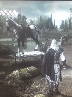さて添付です。今日も時間を見つけてはアサクリ2です。が。またしても小さな事件が(震)。えーっと、地域の名前は忘れましたが、某所で、馬で行う競争ミッションがありまして。導入の会話で、エツィオ「俺が(競争に)買ったら報酬は?」女性「私の個人レッスンが(うんぬんかんぬん)」という件をやりましてそこからミッションクリア→(ムービー)「個人レッスンは?」(→ロマンス突入、ムービー終了)という一連の流れがありました。しかしこのムービーの時、「個人レッスン…」とか言ってる一連のムービーの間、ずっと後ろで、馬が…!