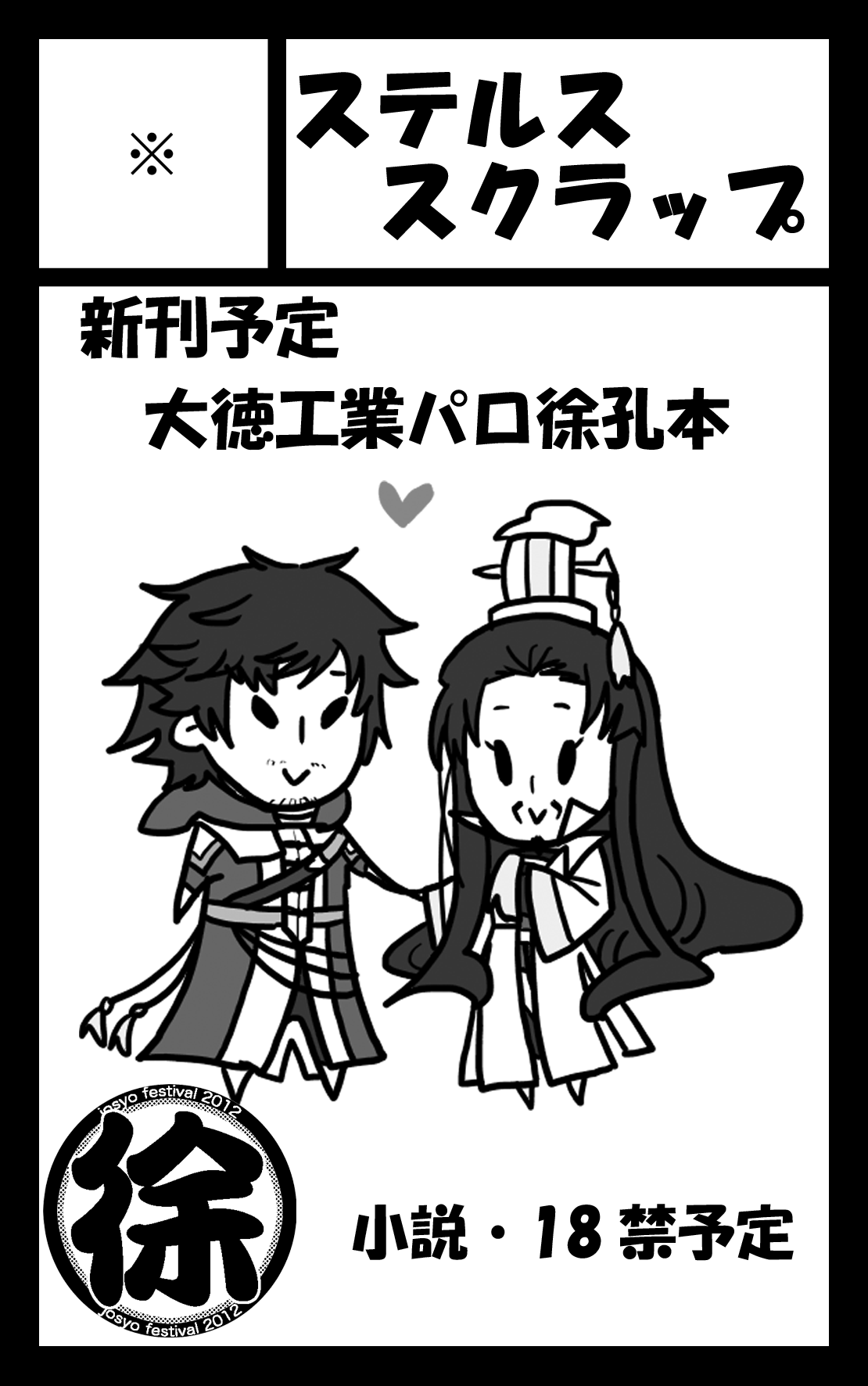 余裕があったら太子の国は今打ってる真っ最中のネタを本にしますが、無理っぽかったらまた別のかたちでどうにかできたらイイなァと思ってます。なんたってカットもこんなだし新刊予定も徐孔なのに、司馬諸で申し込んだんですからね(その節はアンケートのご協力くださりありがとうございました!)。太子の国やると割合、司馬諸でてきますからね…。あ。太子の国はアレですね、一発ギャグ本とかでもイイですね(笑)←