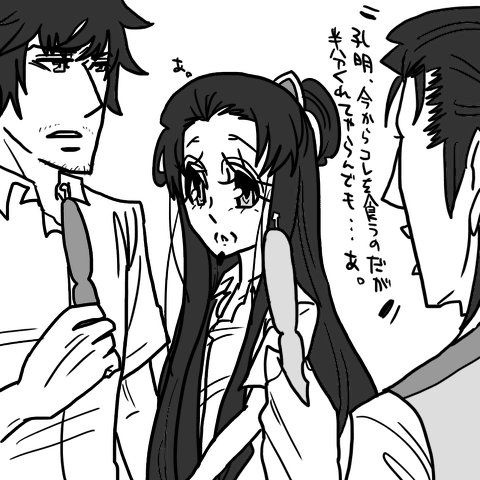 そんなわけで孔明、ちょうどそこにいて一騎打ちの様子を一緒に眺めていた徐庶さんと司馬懿さんの二人に「もうどっちかコレ食べちゃいませんか?」と一騎討ちを尻目にチューペットを差し出します、と↓