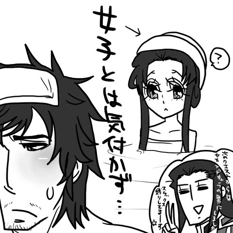 ハイ。メインキャラは女子です。一応タオルは巻いてますよ、と念のため。(サム様代理→徐庶にしてしまったので丈メインキャラ→孔明(女子(仮)にしてしまいましたスイマセン…。右下の都督は、丈セカンドキャラ代理です)