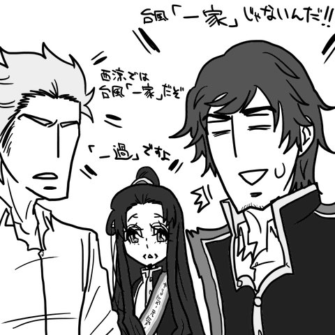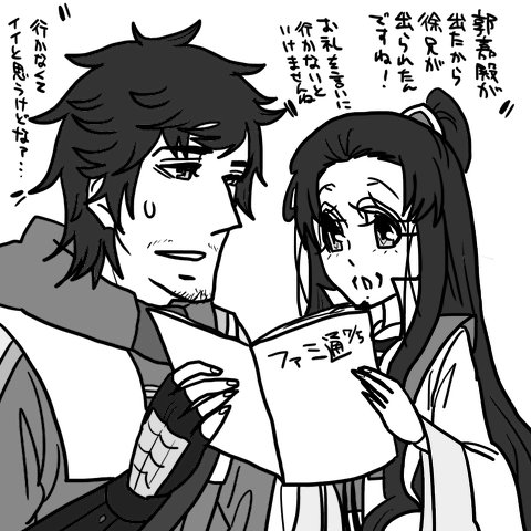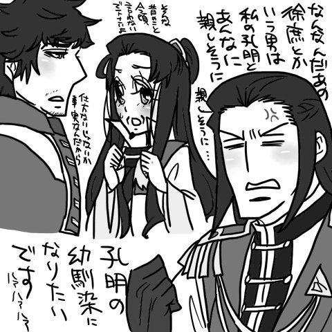 さてどうにかモンハンの(くだらない)話題で掴みを作った後は添付です。徐庶さんと孔明が非常に親しそうにしている現場を目撃してしまった都督は例によって嫉妬に駆られておりますが↓