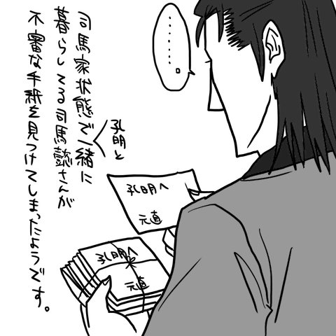 ご覧の通り、「司馬家上体で孔明と一緒に暮らしている司馬懿さんが不審な手紙を見つけてしまった」ところです。全部が全部To孔明From元直で、しかも全部こうまとめて大事そうにまとめてあるところを見て、これは「怪しい…」と。そして、これは絶対に過去に何かあったに違いないと思った司馬懿さんは孔明を問い詰めることにしたようです↓