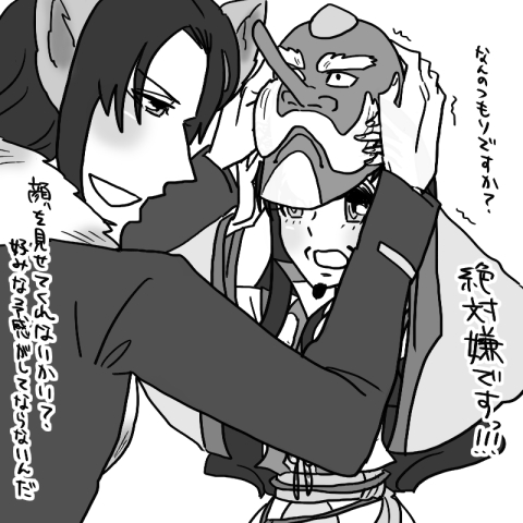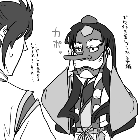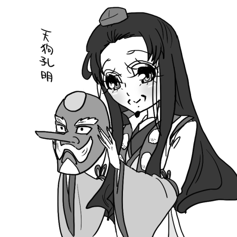 あとこんなんだったらたまらんというのが、キョーイの前以外では天狗の面常備の孔明とか萌えだと思います!例えば、ちょっと里に下りる用事がある時なんかだけカパッとお面着けるとか↓