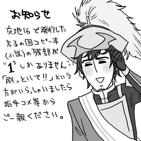 が。前回メインだった太子の国コピー本が、今、手元に残部1しかありません。これもうちょっと刷っといた方がイイんでしょうかどうなんでしょうか(震)?万が一お一人様以上がご興味を持たれていた場合、非常に困ってしまうのではないかと思うので、とりあえずお知らせです。