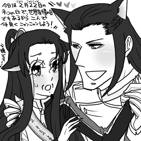 というわけで本日はネコの日なのでネコな添付ですが、司馬諸じゃないです。なんか日めくりカレンダーに「ネコの日」とともに「世界友情の日」ってのも書いてありまして、ふいにこんな瑜諸が浮かんでしまったので瑜諸です↓
