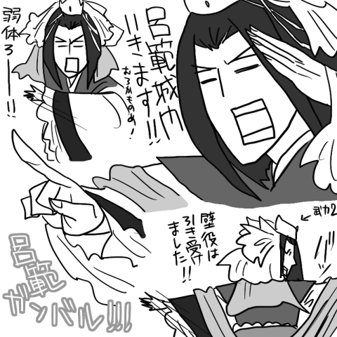 一人城門攻城から弱体弓でのサポート、伏兵サーチに一人で城門死守(壁役)もやったりします。武力8、8、7といる中で、武力2が壁です。いやホント、状況が悪いと呂範が一人でボコられて時間稼いでいる間に残り三人が復活する時もあります。思いのほか呂範が城門攻城してるって気付いた時は笑いました。