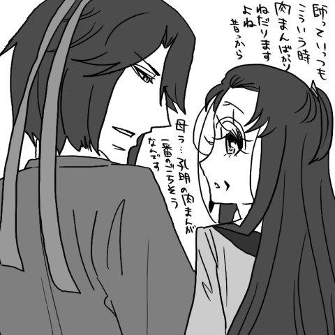 というか、父上と弟ばっかり目立っちゃって、師の印象がいまいち薄くなっちゃってるよね、と。そろそろ師孔を推してもイイんじゃない?ということで師孔妄想です。しかしまたしても「しばけ」で、息子ズが育ってる設定です(毎度毎度ごめんなさい…)。例えば師の誕生日なんかで孔明が「何か食べたい物はありますか?」とか聞くと必ず「孔明の作った肉まん」と答える師。そしてそれに対する反応↓