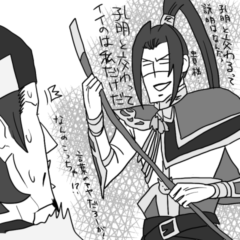 というわけで添付です。サム様より「携帯なくしてあたふたする孔明」というネタをいただきまして。それを聞いた瞬間、丈はこんな孔明を妄想しました↓