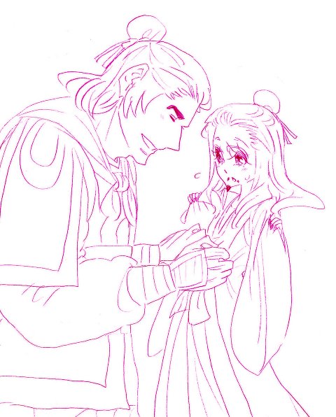 朝の出仕の準備中です。なぜかチョン様が孔明の上着のチョウチョ結びを結びたいようで孔明はちょっと困惑気味です。新手のいちゃつき方です(笑)