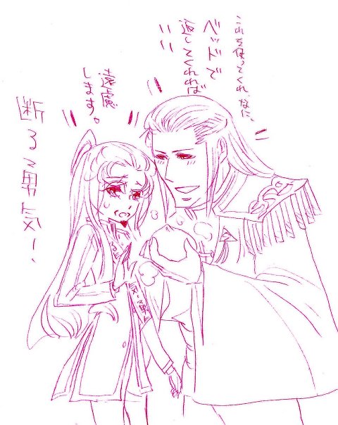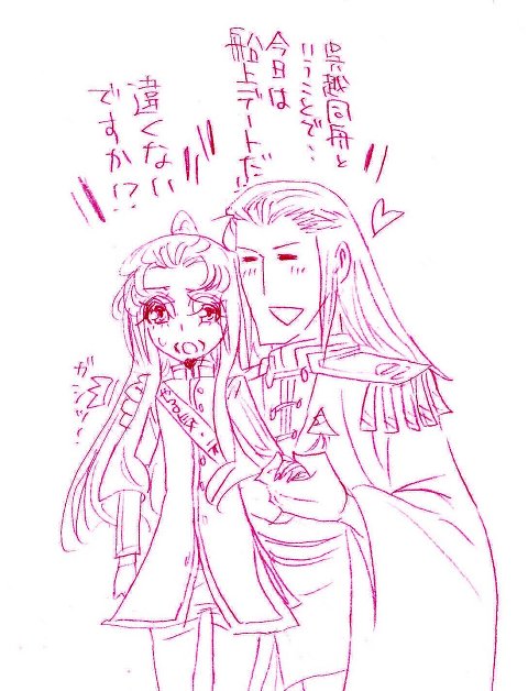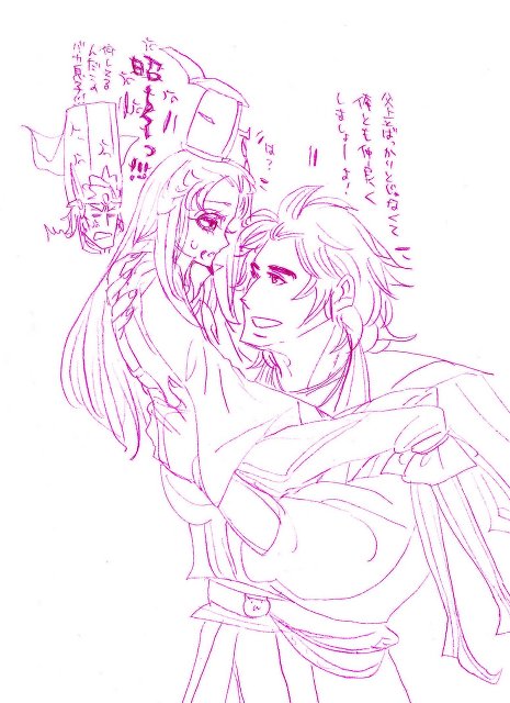 さて力一杯はしゃいだところでやっと添付です。添付は昨日の日記でもちらっと言った、スーツリウビ(校長?)と生徒孔明(生徒会)ってなんかイケナイ雰囲気するな、な添付です↓