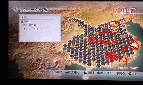 さてチョン様、何戦か繰り返したりトントンの列伝(列伝は本人じゃないと行けないのでトントン)をやったり修学士のクイズに答えたり支配獣として馬2匹買ったりとかそんなことをしていなたのですが、孔明が出ない。敵だろうが味方だろうがとりあえず孔明が出ない!太子とか都督とかガリクとか名家とかひとつも嬉しくないから!とにかく孔明急募!!!都城では無双武将に共闘要請ができたりもするらしく、しかもそれをやると絆が伸びるらしいのでひとまず孔明を要請できる徐州を目指そうと思います。ちなみに徐州の場所ですがこちら↓