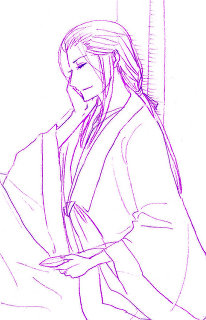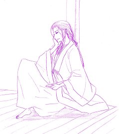 というわけで添付はよく晴明がやってるポーズ(「濡れ縁に腰を下ろし、その背を柱の一本にあずけている。折った左膝を横に倒し、右膝を立てて、その右膝の上に、右肘をのせ、右手の上に右頬をのせている。」「左手の指に玉の盃を持ち、」「赤い唇が常に微かな笑みを浮かべている。」ポーズです)を天華孔明にしてもらいました(絵が小さかったので隣にあぷも)↓