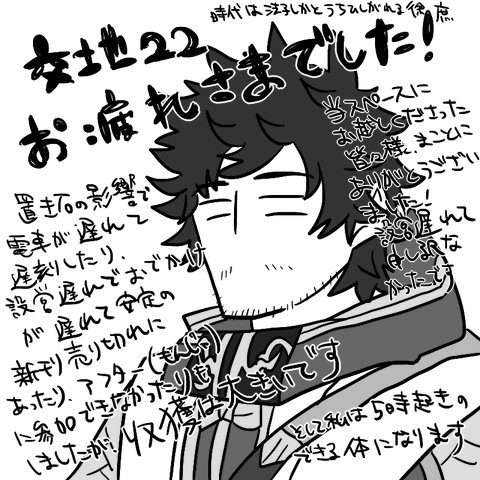 皆さんこんばんは、ムサシ丈です。本日は遂に交地22でしたね!お疲れ様でした!当スペースにお越しくださった皆々様、本当にありがとうございました!設営が遅くなってしまって申し訳ありませんでした!本当は11時にはちゃんとできてるはずだったんです!それもこれも全部置き石のせいで電車が遅れたせいでして…!おのれ置き石…!